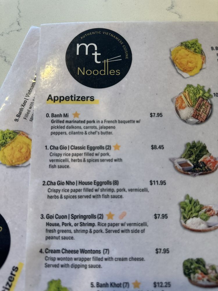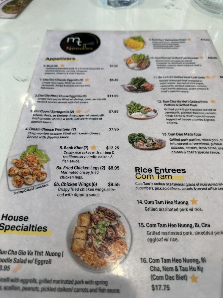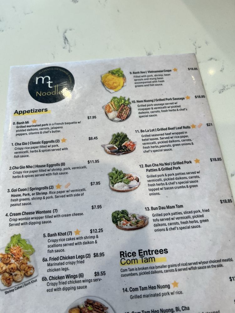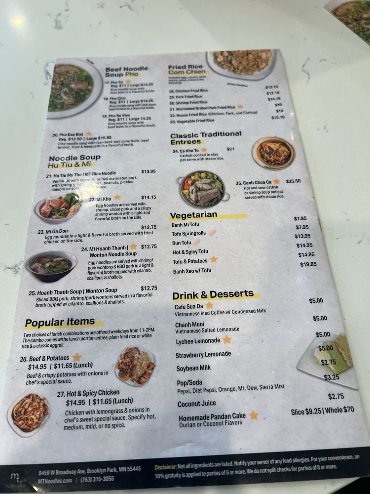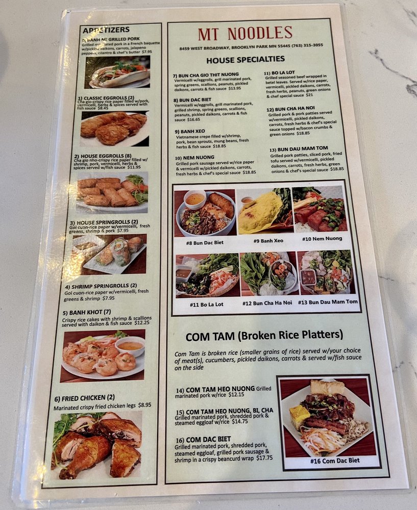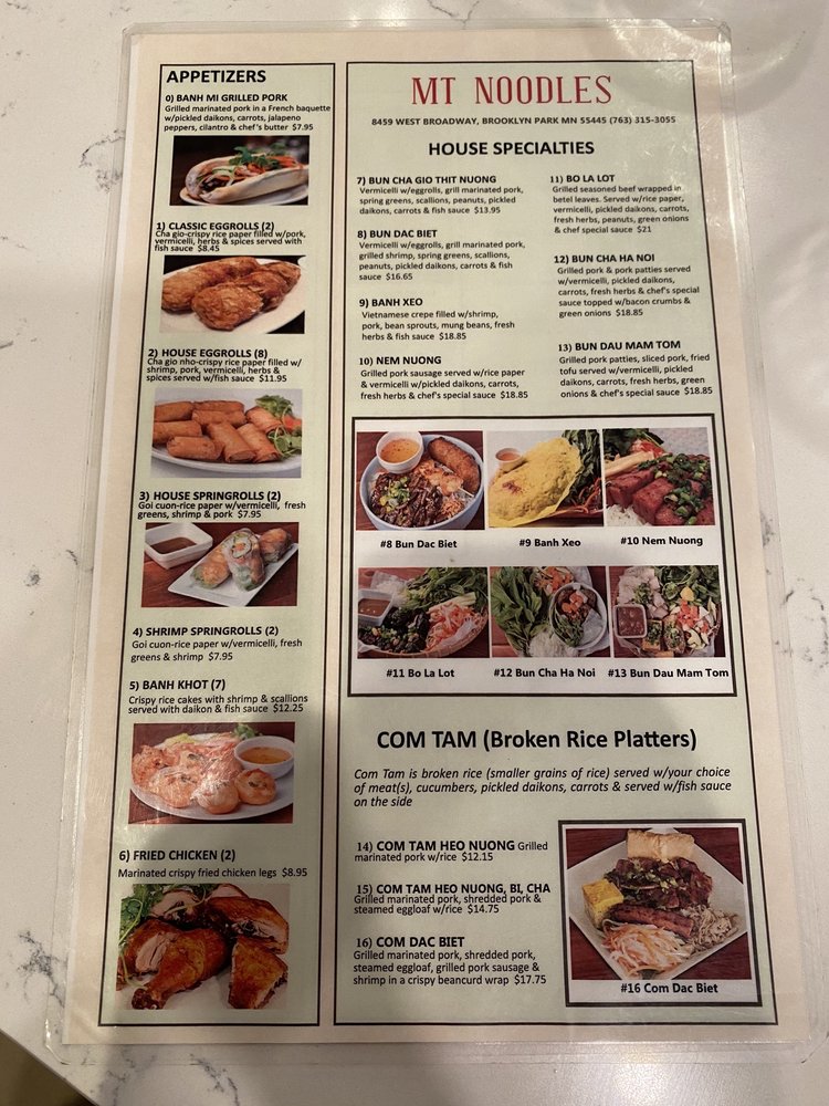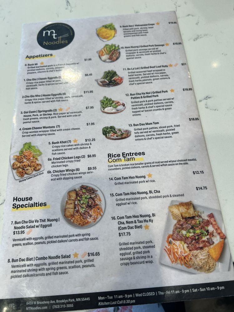 Introducing MT Noodles, a Vietnamese noodle haven in Brooklyn Park, MN. With a diverse menu offering vegetarian options, flavorful appetizers like Banh Mi and Egg Rolls, and house specialties like Banh Xeo and Nem Nuong, this spot caters to all tastes. The Vermicelli Salads are a must-try, with options like Bun Cha Gio Va Thit Nuong and Bun Dac Biet showcasing fresh ingredients and bold flavors. The reviews rave about the generous portions, friendly staff, and modern ambiance of the restaurant. With accessibility features like wheelchair access, outdoor seating, and Wi-Fi, MT Noodles is a convenient and delightful dining experience. Don't miss out on the Broken Rice Platter or the delicious Pho Tai for a satisfying meal. Head over to MT Noodles for a taste of authentic Vietnamese cuisine in a welcoming setting.